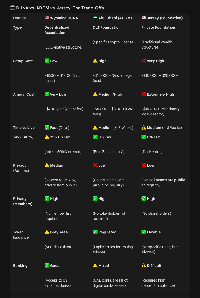 Wyoming has been progressive in regards to modernizing trusts, new corp types, the DUNA etc. Some states have been following paths to specialize in becoming the operating station for various types of legal arrangements or entities, in part because I think they see an opportunity to do what Delaware did as the hub for incorporation the past many decades. Given this, even if the current DUNA structure isn’t perfect, I do like the idea of being in a state that is already showing attention to this, and in a country where the states are competing with each other to develop the best and most robust frameworks for this type of work. Even if we need to transition from the current WY DUNA within a couple years, hopefully the transfer will be easy to another WY or US State’s framework since it’s staying within a single country but in a competitive landscape of jurisdictions vying for improvements.