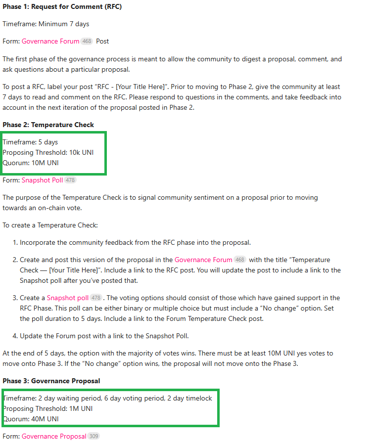 Not sure on the min. values to allow for an RFC and those graduating to an RFP vote (for Uni it’s 1M UNI), but this page is quite helpful as a guideline for us to mirror.