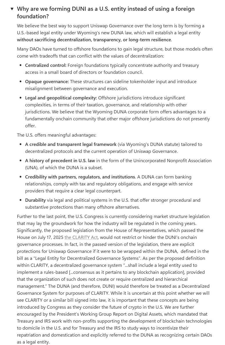 - A Wyoming DUNA doesn’t make it easier for US investors to buy Radix. In some ways it makes it harder. US-based hedge funds, VCs, and institutions do not buy based on entities being domiciled in the US. Otherwise, they wouldn’t be buying Solana, Ethereum, Sui, Aptos, etc., all of which are incorporated in the Cayman Islands. Such investors care primarily about liquidity, custody, and risk (exit risk, headline risk). A project being incorporated in the US adds very chunky risks due to enforcement possibility.